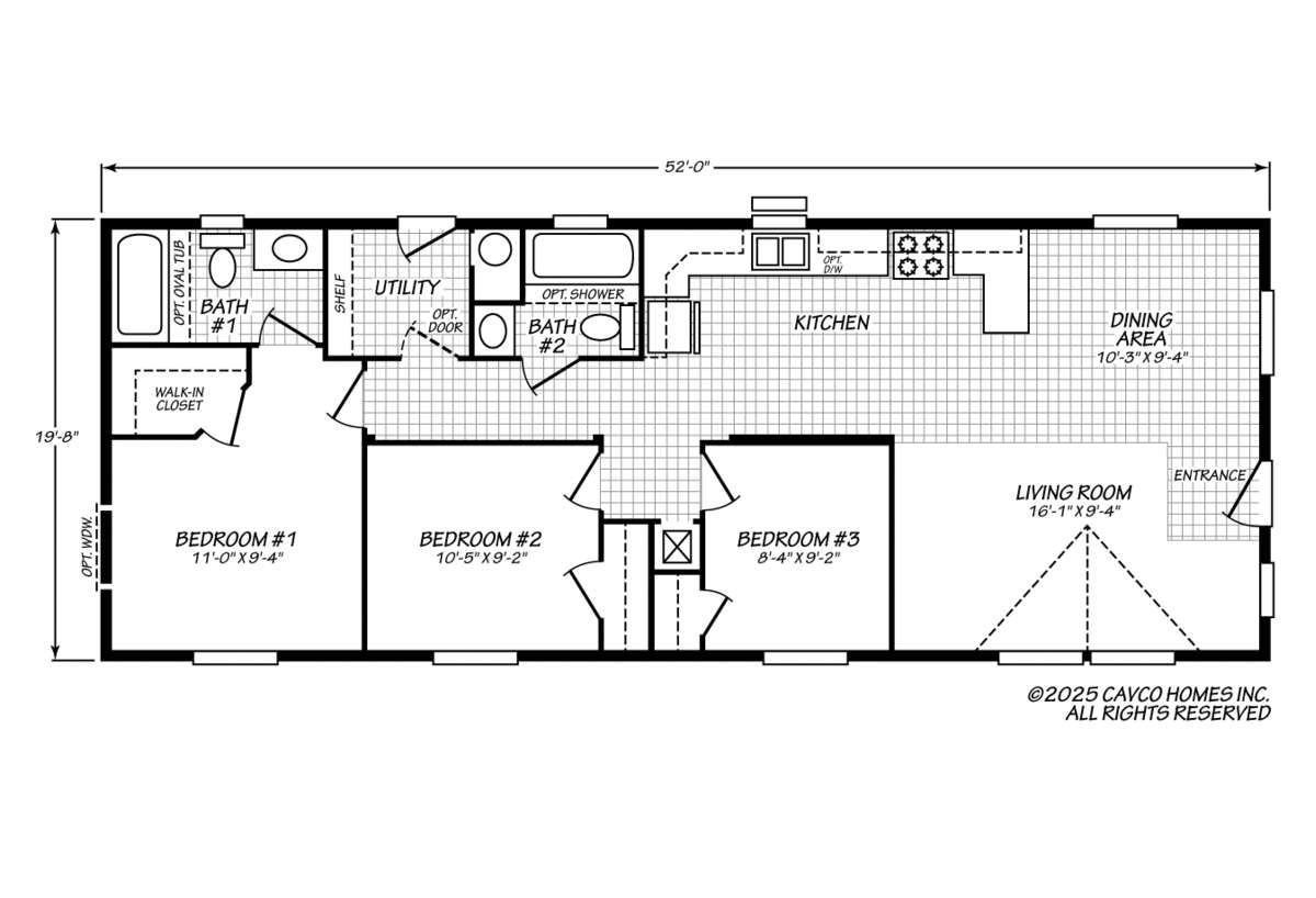 BEDS: 3     BATHS: 2     SQ FT: 1022     W X L: 19′ 8″ x 52′ 0″